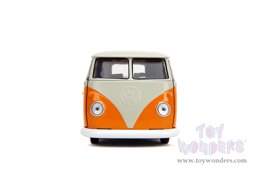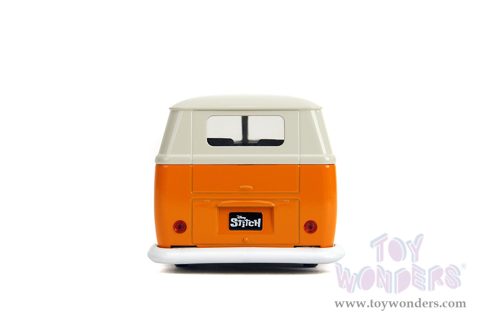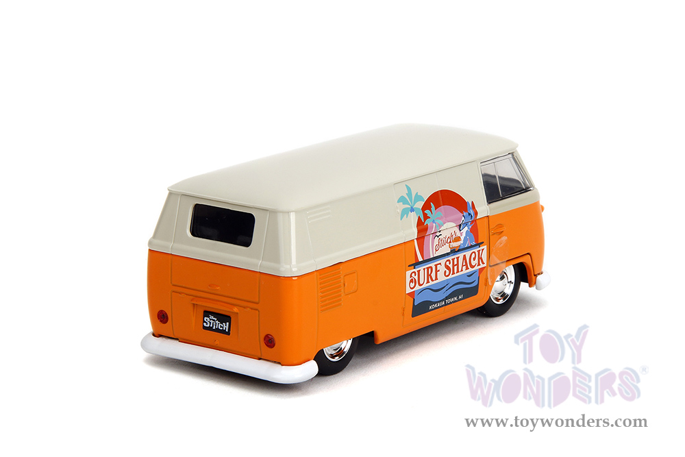36144 Jada Toys - Hollywood Rides | 1961 Disney Stitch Volkswagen Bus "Stitch's Surf Shack". 1:32 scale diecast collectible model car. This Volkswagen is a 4.75"L x 1.75"W x 2"H diecast classic car. Openable doors. This Volkswagen Bus is manufactured by Jada Toys. It comes individually packed in a hang tab window box. Window box is 6"L x 3"W x 4.5"H. Item 36144 is in orange and cream.
