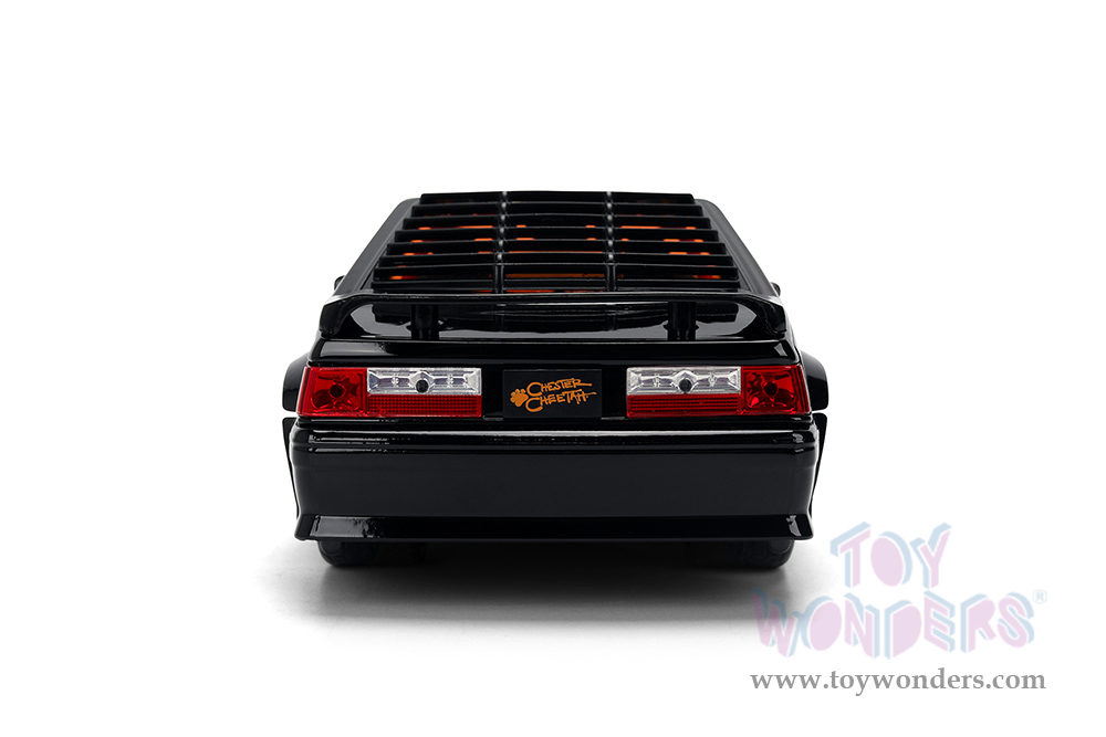 Jada Toys - Hollywood Rides | Ford Mustang GT with Chester Cheetah Diecast Figure "Cheetos® Flamin' Hot®" (1989, 1/24, diecast model car, Black/w Red flames) 36255