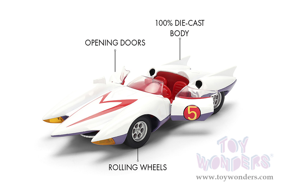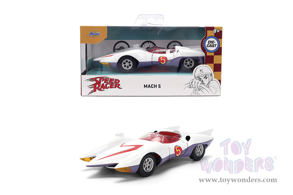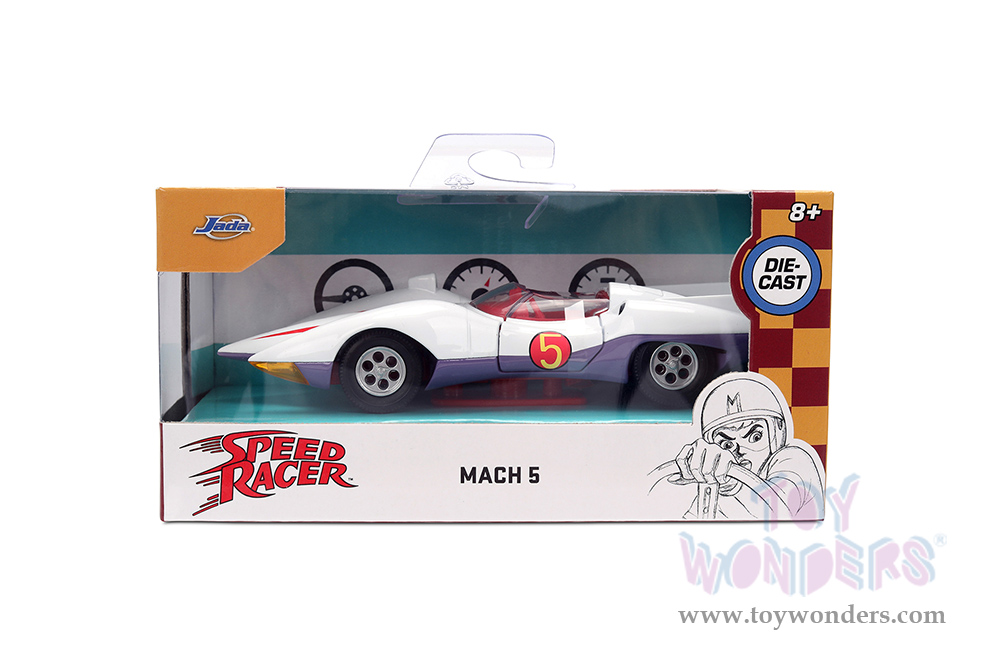 35882 Jada Toys - Hollywood Rides | Mach 5 Speed Racer (1967) TV Series. 1:32 scale diecast collectible model car. This racer car is a 5.25"L x 2.125"W x 1.125"H diecast metal car with openable doors. This car is manufactured by Jada Toys. It comes individually packed in a window box. Window Box is 6"L x 3"W x 3"H. Item 35882 is in white with red interior.