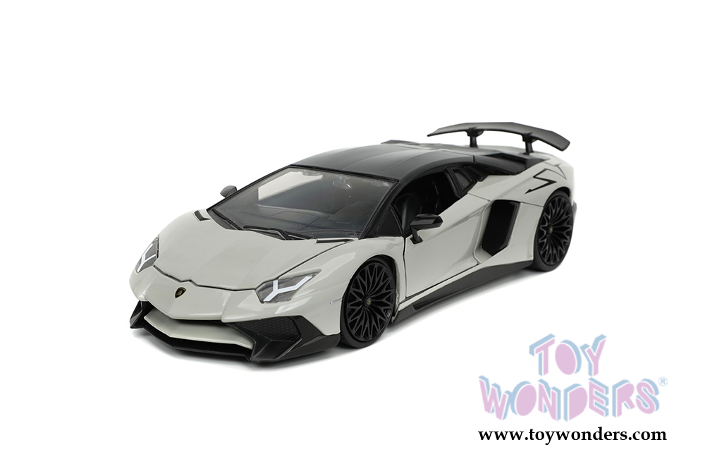 32713/4 Jada Toys Hyper-Spec - Lamborghini Aventador SV Hardtop. 1:24 scale diecast collectible model car. This Lamborghini is a 9"Lx 3.5"Wx 2.25"H diecast metal car with freewheeling, openable doors, frunk and engine compartment. Detailed interior and exterior. This car is manufactured by Jada Toys. It comes individually packed in a window box. Window box is 10"L x 4.75"W x 4.75"H. Item 32713/4 is in Gray with black top.
