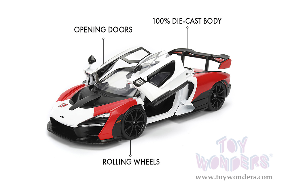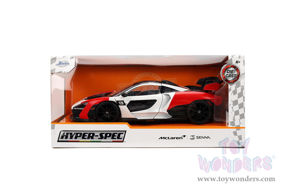 36370 Jada Toys Hyper-Spec - McLaren Senna Hardtop. 1:24 scale diecast collectible model car. This McLaren is an 8"Lx 3.25"Wx 2.25"H diecast metal car with freewheeling, openable hood, doors and trunk. Detailed interior and exterior. This car is manufactured by Jada Toys. It comes individually packed in a window box. Window box is 10"L x 4.75"W x 4.75"H. Item 36370 is in white and red with black top.