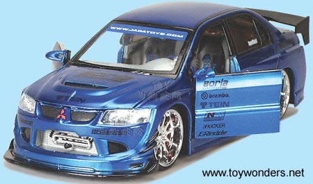 50395AI JADA Import Racer! Mitsubishi Lancer Evo VIII. 1:24 scale diecast model car. This Mitsubishi Lancer Evolution 8 is an 8" long diecast race car with opening doors/hood/trunk. This Mitsubishi Evo 8 hasĀ SEKI rims. 4 pcs per display box and in assorted colors. This Mitsubishi Lancer Evo VIII is manufactured by Jada Toys.