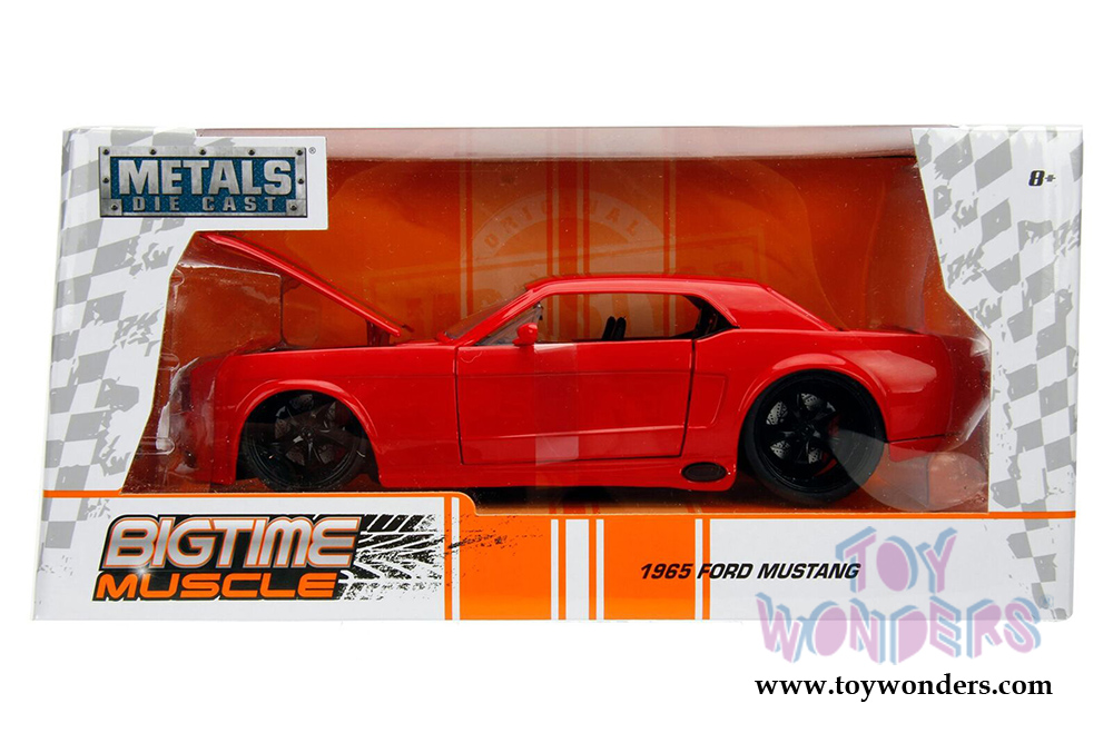 99967WA1 Jada Toys Big Time Muscle - 1965 Ford Mustang GT Hardtop. 1:24 scale diecast collectible model car. This Ford Mustang is an 8.25"L x 3.5"W x 2.25"H diecast with openable doors, hood, and trunk. This '65 Ford Mustang is manufactured by Jada Toys. Item 99967WA1 is in assorted colors. Each car is individually packed in a window box. Window Box size is 10"L x 4.75"W x 4.5"H.