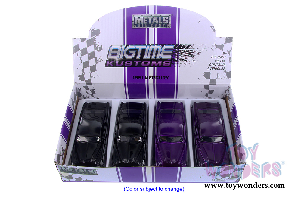 99062DP1 Jada Toys - Metals Die Cast Bigtime Kustoms - 1951 Mercury Hardtop. 1:24 scale diecast collectible model car. This 1951 Mercury is an 8.5"L x 3"W x 2"H with openable doors and hood. This 1951 Mercury is a diecast metal and street lowrider. This Mercury is manufactured by Jada Toys. 4 pcs per display box. 99062DP1 is in assorted colors. 16 pcs per inner.