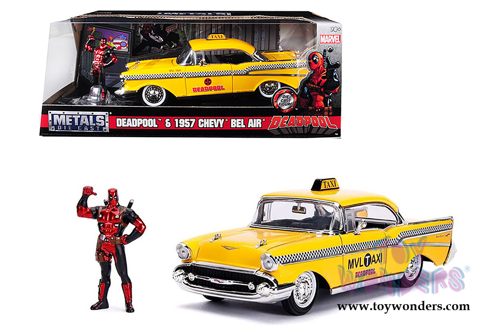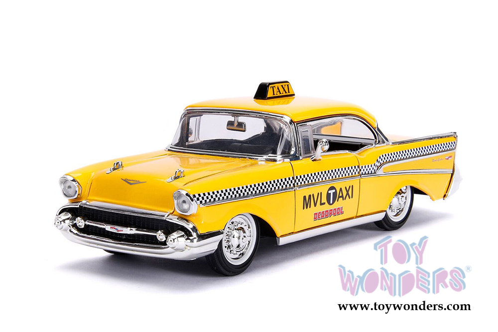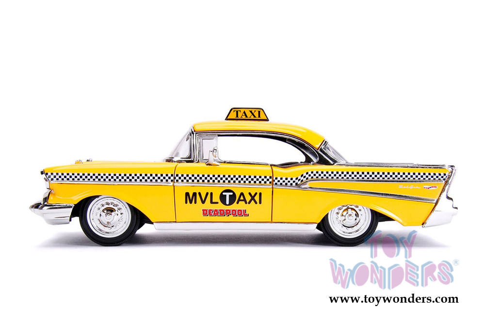 30290 Jada Toys - Metals Die Cast | 1957 Chevrolet® Bel Air® Taxi with Deadpool™ Diecast Figure. Marvel Comics diecast collectible model toy. This Chevy® taxi is an 8.5"L x 3"W x 2.75"H diecast metal car. Deadpool figure is approximately 2.75 inches tall. Manufactured by Jada Toys. Individually packed in a window box WB. Window box is 9.5"L x 4"W x 6.5"H. Item 30290 is YELLOW color.