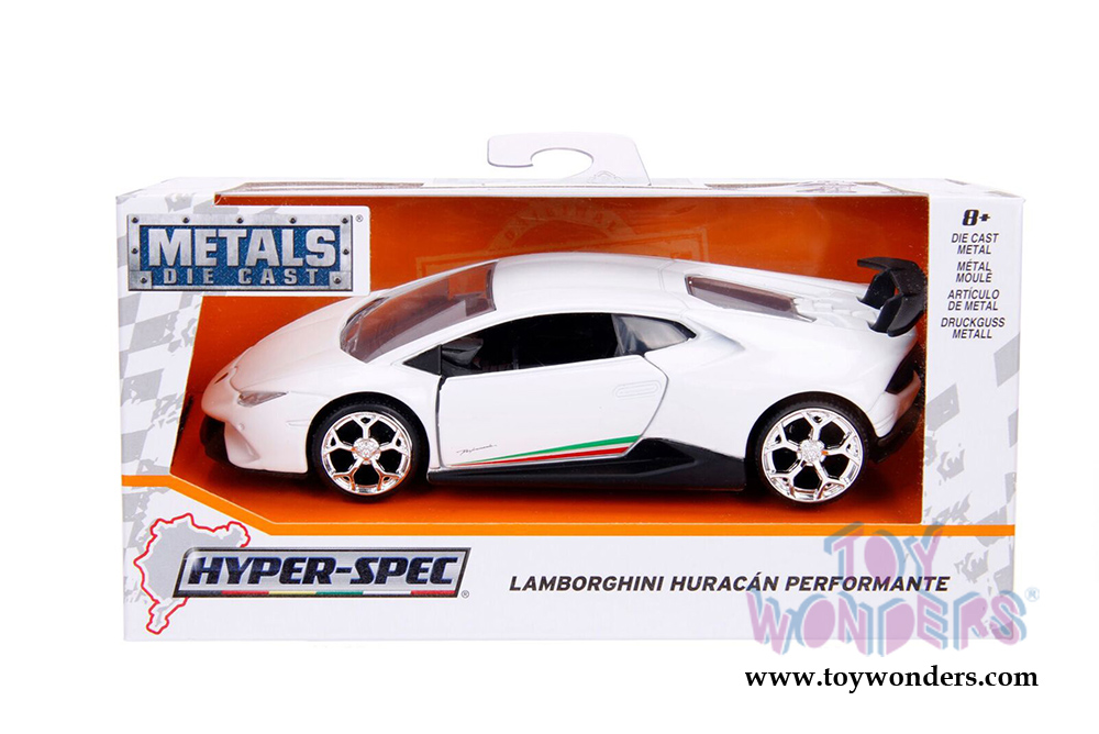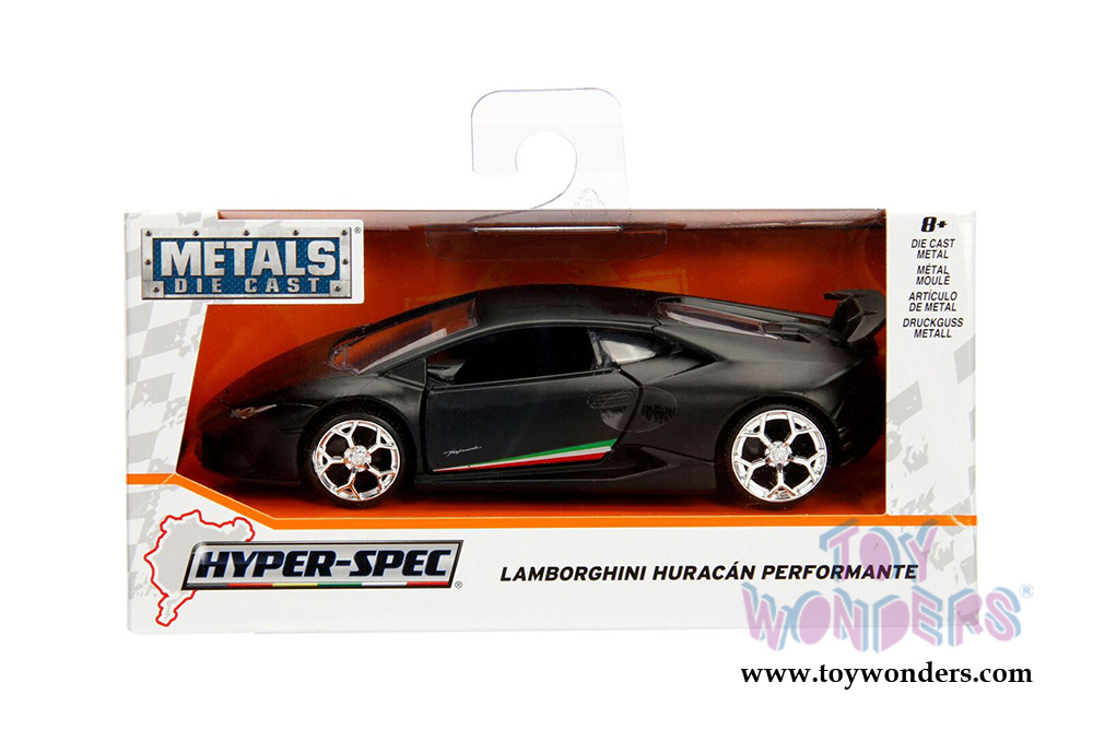 30105WA1 Jada Toys - Metals Die Cast | Hyper-Spec 2017 Lamborghini Huracán Performante Hardtop. 1:32 scale diecast collectible model car. This Lamborghini is a 5.25"L x 2.25"Wx 1.25"H diecast metal cars with opening doors and pullback action. This car is manufactured by Jada Toys. It comes individually packed in a window box. Window Box is 6"L x 3"W x 3"H. Item 30105WA1 is in assorted colors. 12 pcs per inner.