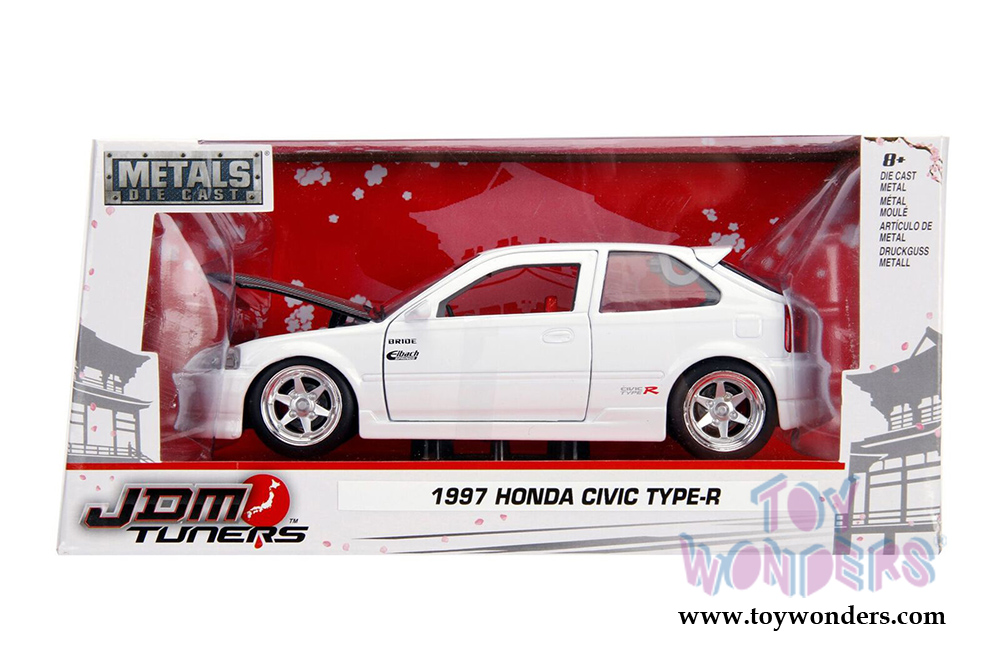 30720 Jada Toys - Metals Die Cast | JDM Tuners™ 1997 Honda Civic Type R. 1:24 scale diecast collectible model car. This Honda Civic is a 7.75"L x 3"W x 2.5"H diecast metal car with opening doors, hood, and trunk. Freewheeling. Detailed interior and exterior. This car is manufactured by Jada Toys. It comes individually packed in a window box. Window Box is 10"L x 4.75"W x 4.75"H. Item 30720 is in Glossy WHITE.