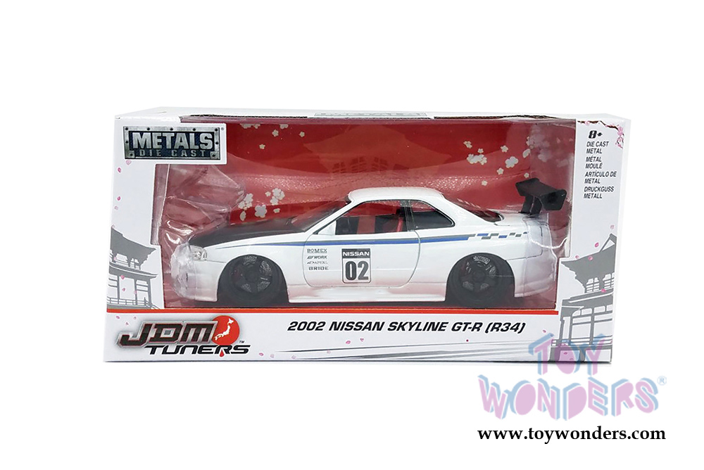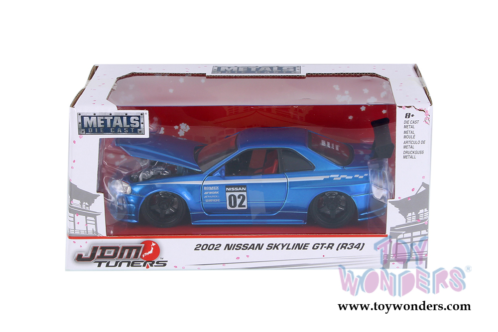 99113WA1 Jada Toys - Metals Die Cast | JDM Tuners™ 2002 Nissan Skyline GT-R Hardtop. 1:24 scale diecast collectible model car. This Nissan is an 8"Lx 3.25"Wx 2.25"H die cast metal car with freewheeling, openable doors, hood, and trunk. Detailed interior and exterior. This car is manufactured by Jada Toys. It comes individually packed in a window box. Window Box is 10"L x 4.75"W x 4.75"H. Item 99113WA1 is in assorted colors. 6 pcs per inner.