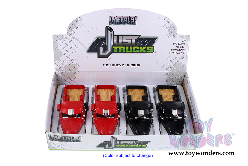 99036DP1 Jada Toys - Metals Die Cast Just Trucks | 1951 Chevy® Pick Up. 1:24 scale diecast collectible model car. This Chevrolet® is an 8.5"L x 3.25"W x 2.75"H diecast car with openable doors, hood, and tailgate. This Chevy Truck is manufactured by Jada Toys. Item 99036DP1 is in assorted colors. 4 pcs per display box. 16 pcs per inner.