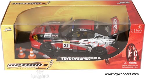 90810BK OPTION D Toyota Supra. 1:18 scale diecast model car. 9.25" long diecast race car with opening doors/hood/trunk. Included 2 corns. Jada Toys. 90810 in BLACK color with graphic. Individually packed in a window box.