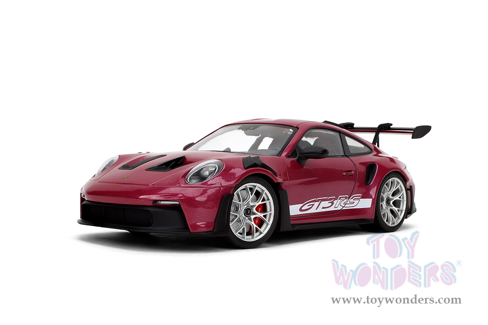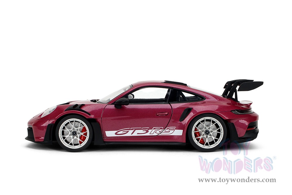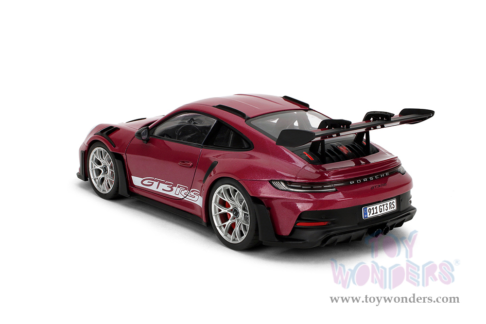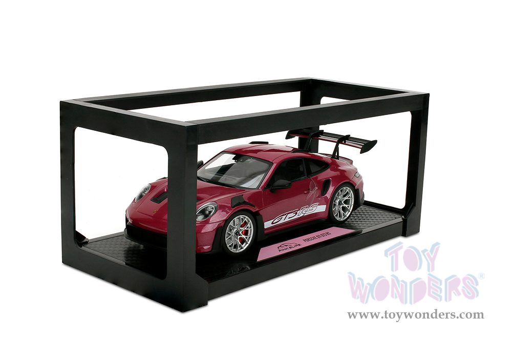 36469 Jada Toys Pink Slips - Porsche 911 GT3 RS with Display Base. 1:18 scale diecast collectible model car. This Porsche is a 10"L x 4.125"W x 2.25"H diecast metal car with openable doors and a Pink Slips branded base. This Porsche 911 is manufactured by Jada Toys. 36469 is in cabernet color. Individually packed in a Window Box WB. Box size: 12.5"Lx 6"Wx 5.5"H.