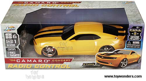 91779 Jada Toys - R/C 2006 Bumblebee Chevy Camaro Concept Hard Top. 1:16 scale, 11" long radio controlled car, full function. Includes controller, antenna. Requires 6 "AA" & 1 "9V" batteries (not included). 27 MHz. Box size: 16"L x 7"W x 6"H. This radio controlled Chevrolet Camaro is manufactured by Jada Toys. 91779 in YELLOW color with Black stripes. Note: This item contains no any diecast metal. GM is a trademark of the General Motors Corporation.