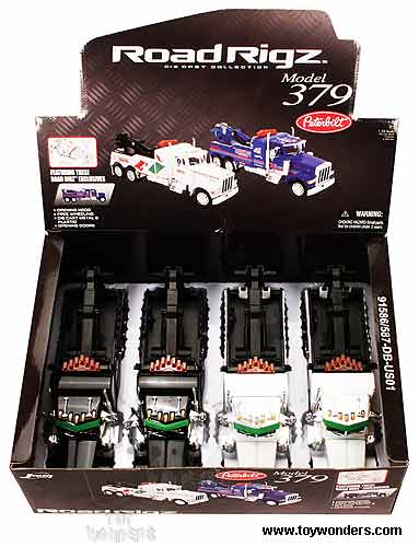 91586 Jada Toys RoadRigz - Peterbilt 379 Model Tow Truck. 1:32 scale dicast collectible model car. This Peterbilt 379 wrecker is an 11.25"Lx 3.5"Wx 4"H die cast metal car with openable hood & doors. Free wheeling. This Peterbile 379 tow truck is manufactured by Jada Toys. 4 pcs per display box in assorted colors with Mexican flag. 12 pcs per inner.