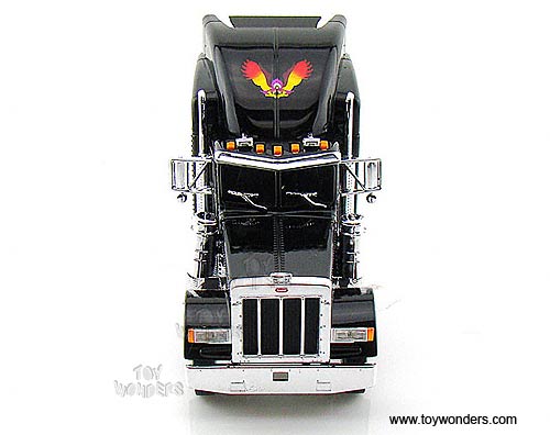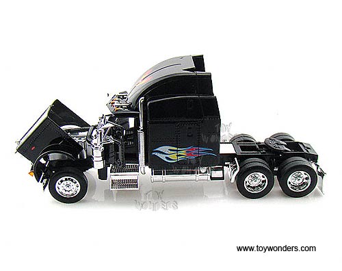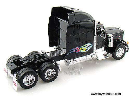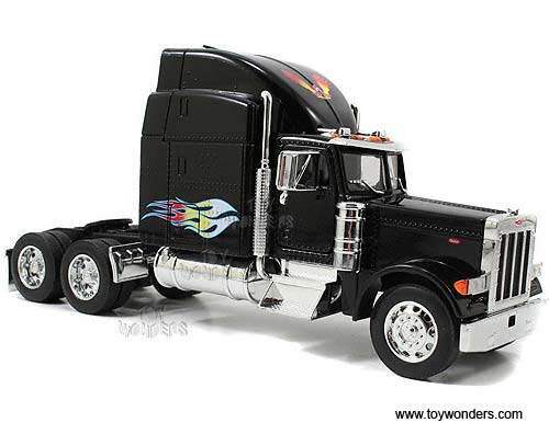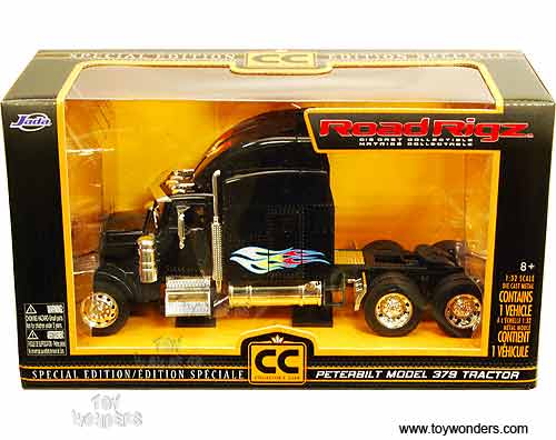 23100 Jada Toys RoadRigz - Peterbilt 379 Model Tractor Trailer Cab. 1:32 scale diecast collectible model car. This Peterbilt 379 is a 10.75"Lx 3"Wx 4.75"H die cast metal car with openable hood & doors. Free wheeling. This Peterbilt 379 truck is manufactured by Jada Toys. Individually packed in a window box. Box size: 12"Lx 4.75"Wx 7"H. 23100 is in BLACK color with flames.