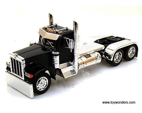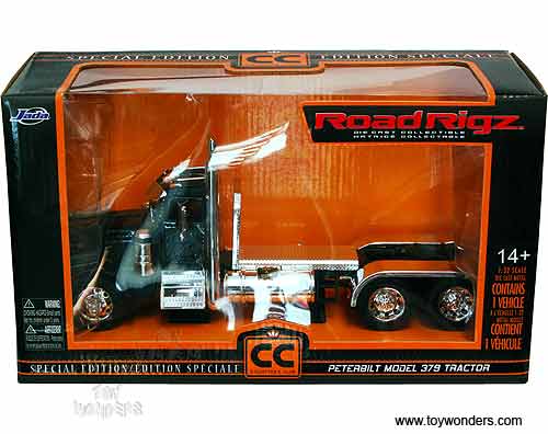 23101 Jada Toys RoadRigz - Peterbilt 379 Model Tractor Trailer Cab. 1:32 scale diecast collectible model car. This Peterbilt 379 is a 10.5"L x 3.25"W x 4"H die cast metal car with openable hood & doors. Free wheeling. This Peterbilt 379 truck is manufactured by Jada Toys. Individually packed in a window box. Box size: 12"Lx 4.75"Wx 7"H. 23101 is in BLACK color.
