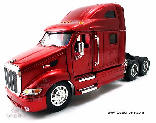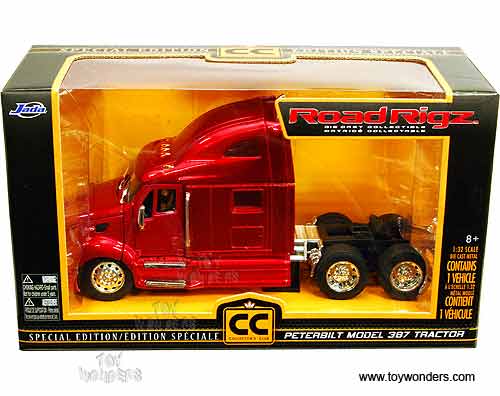 23150 Jada Toys RoadRigz - Peterbilt 387 Model Tractor Trailer Cab. 1:32 scale diecast collectible model car. This Peterbilt 387 is a 10.75"Lx 3"Wx 5"H die cast metal car with openable hood & doors. Free wheeling. This Peterbilt 387 truck is manufactured by Jada Toys. Individually packed in a window box. Box size: 12"Lx 4.75"Wx 7"H. 23150 is in RED color.