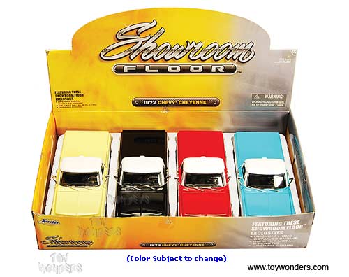 92371 Jada Toys Showroom Floor - 1972 Chevy Cheyenne Pickup Truck. 1:24 scale diecast collectible model car. This Chevrolet Cheyenne Pick-up Truck is an 8"L x 3.25"W x 2.5"H die cast metal car with openable hood, doors & tailgate, removable truck cover, and detailed engine. This Chevy Cheyenne Pick up is manufactured by Jada Toys. 4 pcs per display box in assorted colors. 16 pcs per inner. GM is a trademark of the General Motors Corporation.