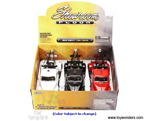 90999 Jada Toys Showroom Floor - 1953 Chevy Tow Truck 66 Highway. 1:24 scale diecast collectible model car. This Chevrolet Wrecker is an 8.5"L x 3.25"W x 3.5"H die cast metal car with openable doors & hood. Details & Chromed-out engine. The 1953 Chevy tow truck is manufactured by Jada Toys. 3 pcs per display box in assorted colors. 12 pcs per inner box. GM is a trademark of the General Motors Corporation.