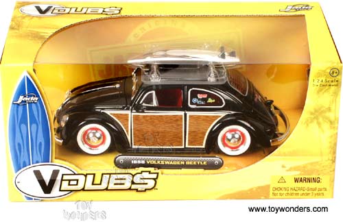 91212 VDUBS - 1959 VW Beetle with Surfboard. 1:24 Scale diecast model car. 7.75"Lx 3"Wx 2.75"H die cast metal beetle with opening hood, doors and trunk. Volkswagen. Jada Toys DUB City. V DUBS, V-DUBS, V-DUB$, VDUB$, V DUB$. Individually packed in a window box WB. Box size: 10"Lx 4.75"Wx 4.75"H. 6 pcs per inner box.