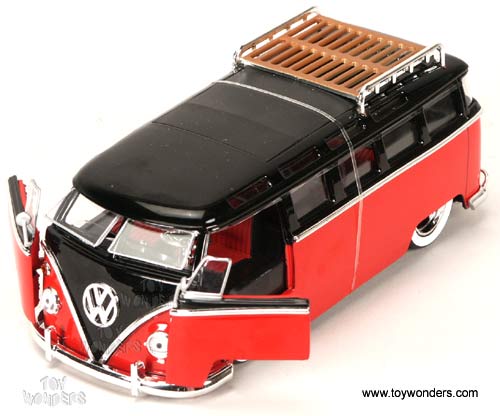 90856MT VDUBS- 1962 VW Microbus with rack. 1:24 scale diecast model car. This Volkswagen bus is 8"Lx 3.25"Wx 3.25"H die cast car with opening doors. Rims: