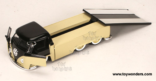91408MT VDUBS - 1963 VW Pick up with Sliding Bed. 1:24 Scale diecast collectible model pick-up truck. This Volswagen pickup is 9"Lx 3.25"Wx 2.75"H die cast metal car with openable doors, front windows and rear engine compartment. Details & chromed-out engine. Sliding bed tilts down. Rims: VW Stock Babymoon. Manufactured by Jada Toys DUB City. V DUBS, V-DUBS, V-DUB$, V DUB$, VDUB$. 4 pcs per display box in assorted 2 tone colors. 16 pcs/inner.