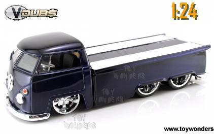 91168LK VDUBS - 1963 Volkswagen Pickup with Sliding Bed. 1:24 Scale diecast model pick up truck. This VW pick-up is a 9.25"Lx 3"Wx 2.5"H die cast metal car with openable doors & front safari windows. Sliding bed can be tilted down. Rims: