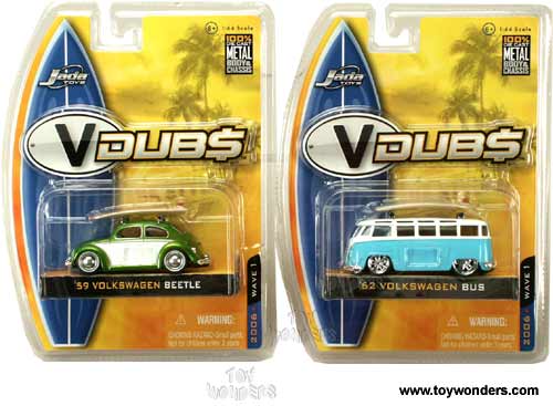 12062W1S VDUBS - WAVE 1. 1:64 scale diecast collectible model cars. 3" long die cast cars. Manufactured by Jada Toys DUB City. V DUBS, V-DUBS, V-DUB$, V DUB$, VDUB$. 12062W1S in assorted colors and styles. Each car individually blister carded. Assortment includes the following cars: