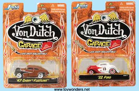 12021W2 Von Dutch Garage Wave 2. 1:64 scale. 3" diecast metal free wheel classic car. Great assortment of vehicles that include the 1958 Chevy Impala, 1959 Chevy Impala, 1940 Ford, 1939 Chevy Delivery Sedan, 1947 Chevy Fleetline, and 1932 Ford. Each vehicle is available in two different colors. The 58 Chevrolet Impala, 59 Chevrolet Impala, 40 Ford, 39 Chevrolet Delivery Sedan, 47 Chevrolet Fleetline, and 32 Ford. 6 asstd. styles. Each cars comes in 2 asstd. colors. Manufactured by Jada Toys. 12 pcs/inner. Each car individually blister carded. Card size: 6"x9".