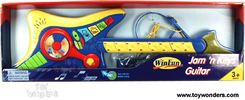 2042NL Battery Operated Jam 'n Keys Guitar with Headset Microphone. This 27.5" long multi-activity rock instrument features 8 key rock guitar with 3 activity modes, 8 preprogrammed tunes, DJ scratch pad for mixing zany sounds, 3 rhythm beats, 6 sound effects and guitar variations. Automatic shut-off. For ages 3+ years. Includes 4 "AA" batteries. Box size: 28"Lx 9"Wx 3"H.