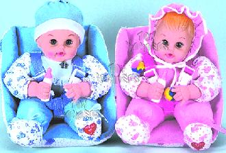 95045M/2 Joe & Judy. 12" musical baby dolls with musical tunes. Dolls secured within baby car seats with straps to be used as a backpack. Requires 2 "AA" batteries. Assorted styles. 6 pcs/display.