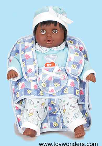 20523CKB Joe and Judy. 12" Soft vinyl baby girl doll with backpack. Box size: 21"L x 8.5"W x 12.5"H. 8 pcs/display. Dark, Musical doll.