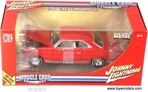53760BR JOHNNY LIGHTNING JL 1966 Chevy Nova SS. 1:24 scale diecast collector model car. 7.5"L x 2.75"W x 2"H die cast metal car. This 1966 Nova SS features opening hood & doors. RC2 brands ref. no. 53760B in RED color. Individually packed in a Window Box WB. Box size: 10"L x 5"W x 4.5"H.