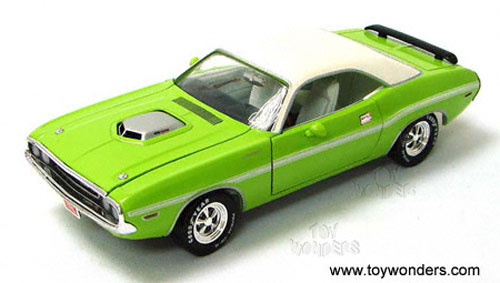 53758AGN JOHNNY LIGHTNING JL 1970 Dodge Challenger R/T. 1:24 scale diecast collector model car. This 1970 Challenter R/T features opening hood/doors with a White top. RC2 ref. no 53758A in Window Box WB. 53758 in Lime GREEN color.