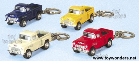 2516KD 1955 Chevrolet Stepside Pick Up key chains Scale: 1:64 1955 Chevy Stepside 2.5"L die cast metal pick-up features pull-back motor action. Manufactured by Kinsmart 12 pcs per display box 144 pcs per inner box in assorted colors