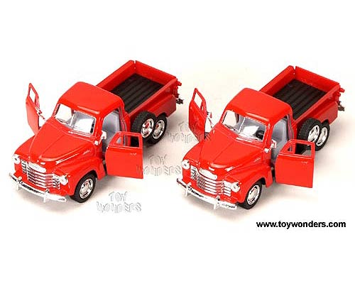 5035DR Kinsmart - 1953 Chevy 3100 Pickup Truck. 1:38 scale diecast collectible model car. The Chevrolet 3100 pick up is a 5"Lx 2.25"Wx 2"H die cast metal car with openable doors & tailgate, and pullback action. This 53 Chevy 3100 pick-up is manufactured by Kinsmart. 12 pcs per display box and in RED color. 72 pcs per inner box. GM is a trademark of the General Motors Corporation.