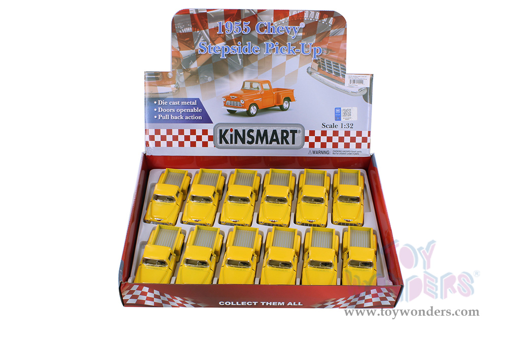 5330DYL Kinsmart - 1955 Chevy® Stepside Pickup Truck. 1:32 scale diecast collectible model car. The Chevrolet® Stepside pickup is a 4.75"L x 2"W x 1.75"H die cast metal car with openable doors, and pullback motor action. This '55 Chevrolet® Stepside pick-up is manufactured by Kinsmart. 12 pcs per display box and in Yellow. 72 pcs per inner box. GM is a trademark of the General Motors Corporation.