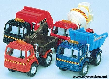 3758 Construction Trucks 3.75"L die cast metal pull trucks with pullback motor action and movable parts in assorted styles & colors. Includes dump truck, cement truck, garbage truck, crane truck, and more. Manufactured by Kinsmart 12 pcs per display box 72 pcs per inner box