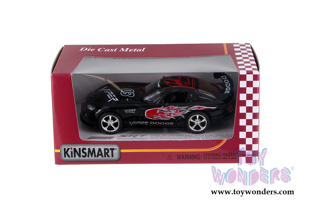 5039FWBK Kinsmart - Dodge Viper Race Car #03 with decals. 1:36 scale diecast collectible model. This Dodge Viper is a 5" diecast metal pull back sports car with openable doors. Race decals. These Dodge Vipers are manufactured by Kinsmart. Item 5039FWBK is in BLACK. Individually packed in a window box. Box size: 6.25"L x 3.25"W x 2.75"H.