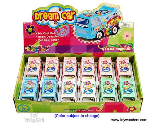 4102/2D Kinsmart - Dream Car. 3.5"L x 1.75"W x 2"H diecast car with openable doors and pull back motor action. 12 pcs/display box in assorted colors. This Dream Car is manufactured by Kinsmart/ Kinsfun.