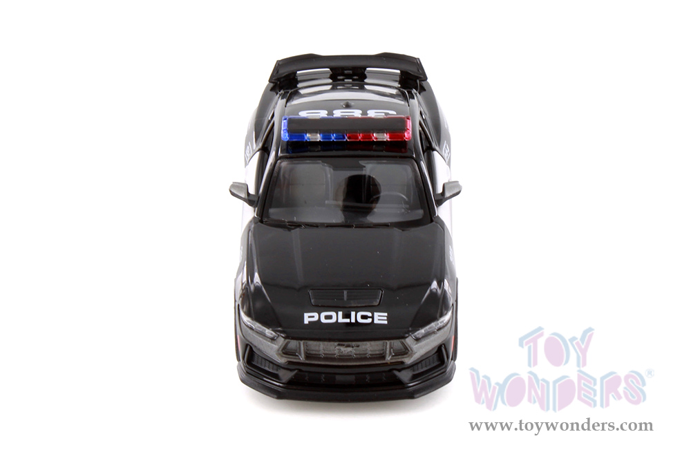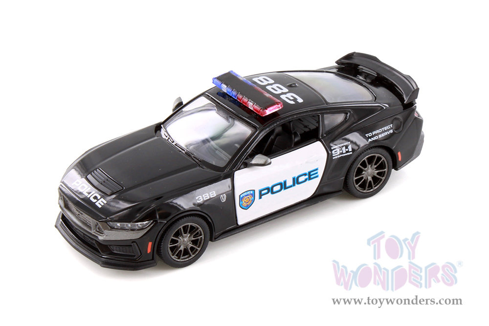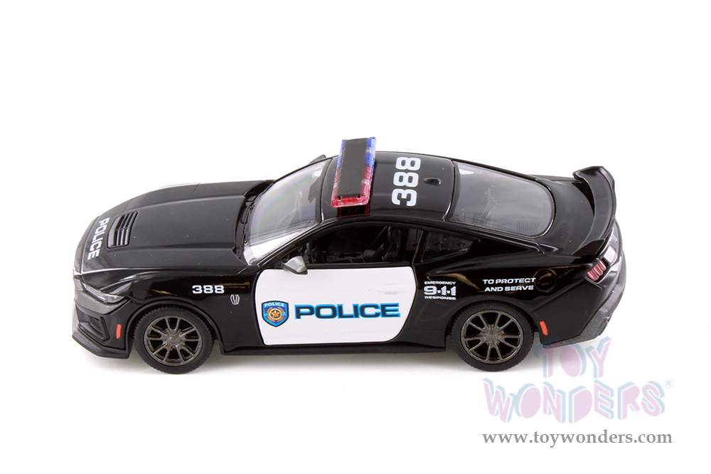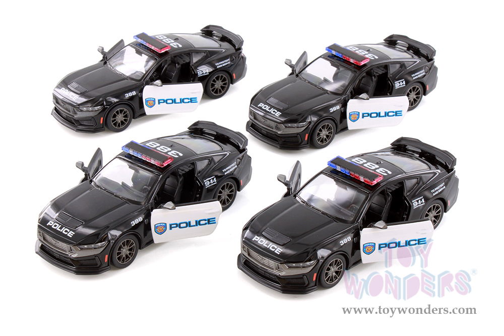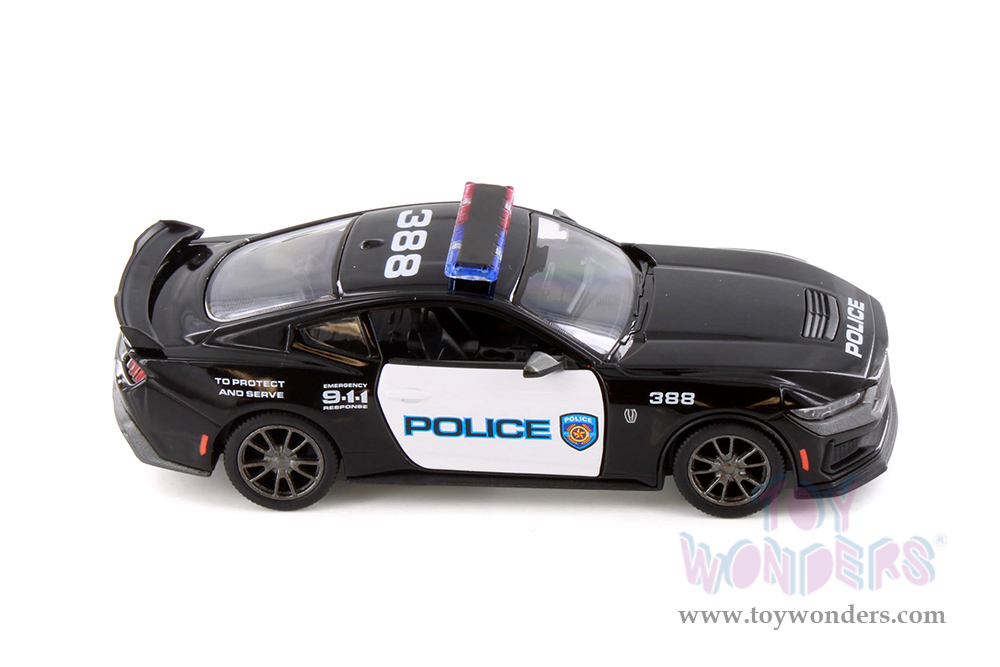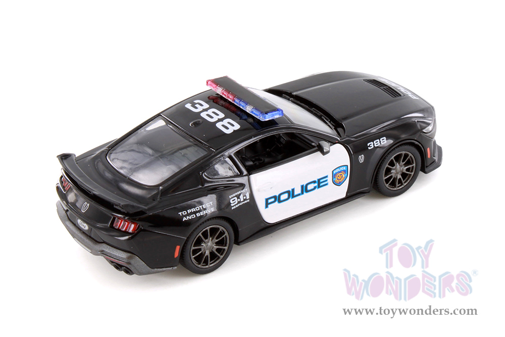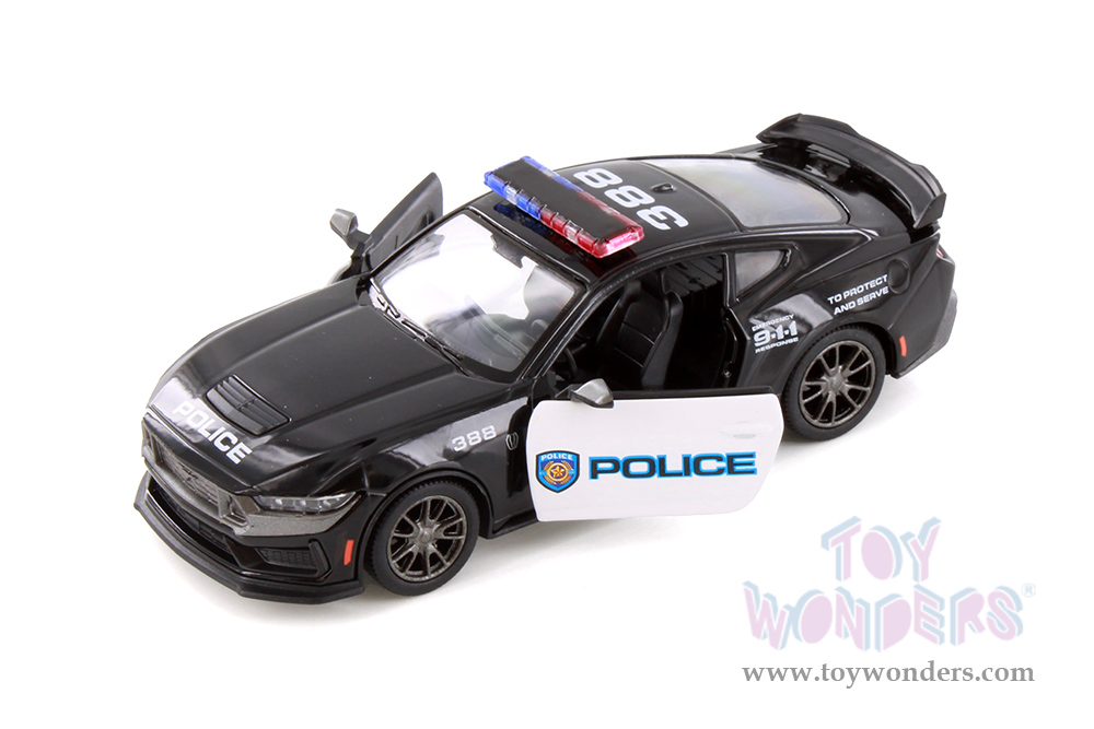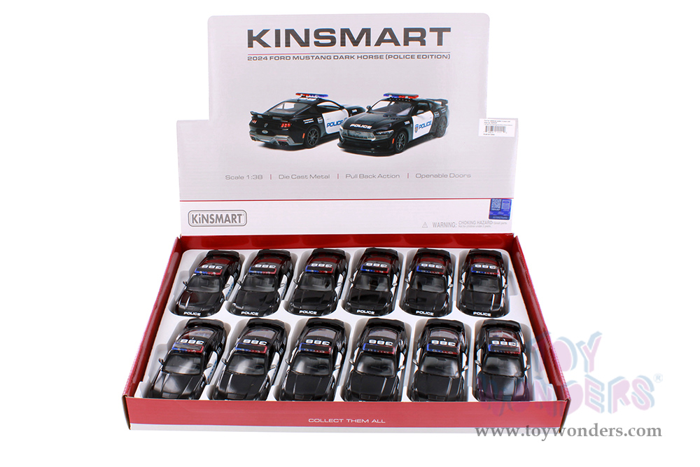 5455DP Kinsmart - 2024 Ford Mustang Dark Horse Police Edition. 1:38 scale diecast collectible model car. This Ford Mustang is a 5"L x 2"W x 1.5"H diecast metal car with pullback action and openable doors. This Ford Mustang Police is manufactured by Kinsmart. Display of 12 pcs in black with white doors. Inner box: 72 pcs.