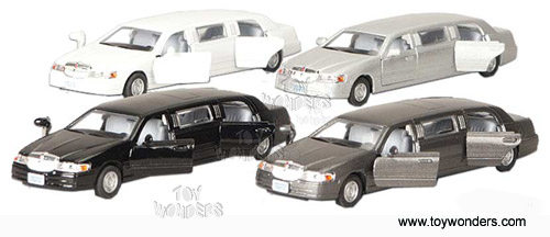 5101D 1999 Ford Lincoln Town Car Stretch Limousine. 1:52 scale diecast model car, 5" long diecast metal limo. Features four opening doors and pull back action. 12 pcs/display. 144 pcs/inner. Manufactured by Kinsmart. 5101 in six assorted colors.