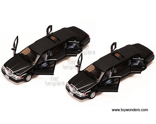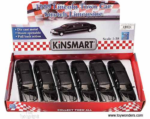 7001DK Kinsmart - 1999 Lincoln Town Car Stretch Limousine. 1:38 scale diecast collectible model car. This 1999 Lincoln Limo is a 7" diecast metal pullback with openable sunroof, hood, and openable doors. This 99 Lincoln Limousine is manufactured by Kinsmart. 6 pcs per display box in BLACK color. 36 pcs per inner box.