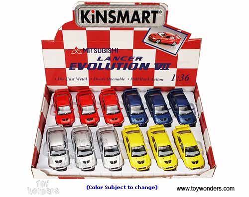 5052D Kinsmart - Mitsubishi Lancer Hard Top. 1:36 scale diecast collectible model car. This Mitsubishi is a 5" long die cast metal Lancer Evolution race car with pullback motor action and openable doors. The Mitsubishi is manufactured by Kinsmart. 12 pcs per display box in assorted colors. 72 pcs/inner.