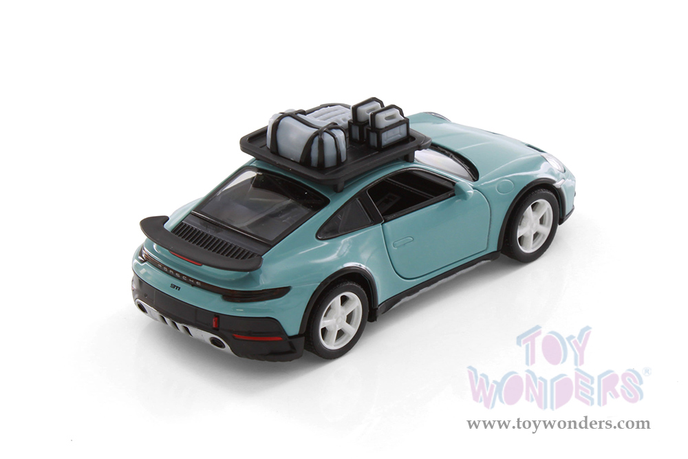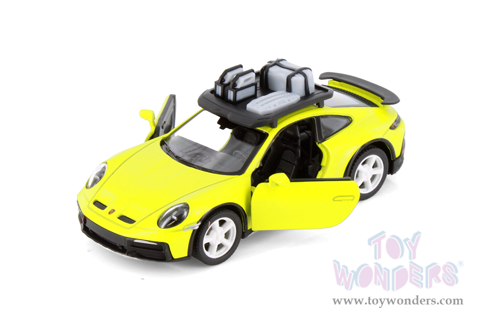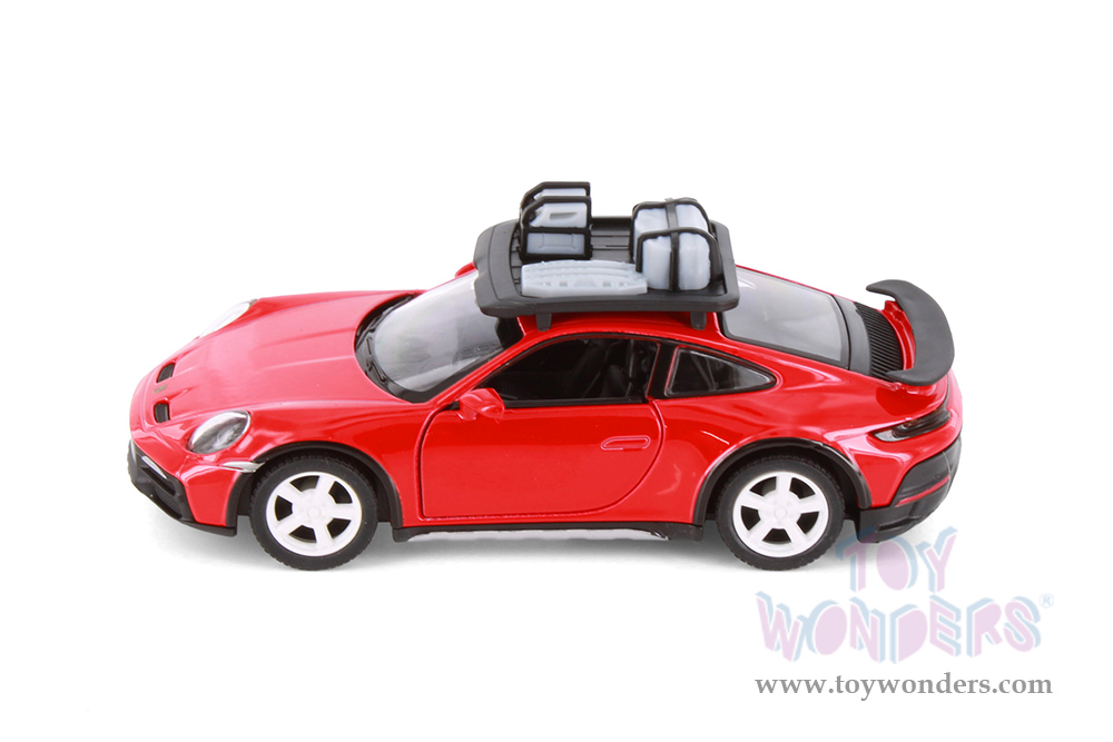 5481D Kinsmart - Porsche 911 Rallye with Roof Rack 1:36 scale. This Porsche 911 is a 5"Lx 2"Wx 1.75"H diecast metal car features opening doors and pullback motor action. Manufactured by Kinsmart. 12 pcs per display box in assorted colors. 72 pcs per inner box
