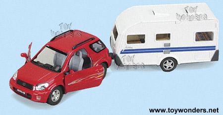 5041CA Kinsmart - Toyota RAV4 and Camper. 1:32 scale diecast collectible model car. This Toyota Rav 4 is a 5" long SUV diecast with pull back action and opening doors. Camper has opening roof and side and also molded furnishings. Bubble packed together (11.75"Lx 3.5"Hx 3"W). This Toyota Rav-4 and Camper is manufactured by Kinsmart/ Kintoy. 12 pcs per inner box.