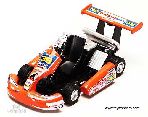 5102D Kinsmart - Turbo Go Kart #38. This Turbo Go Kart is 5"L x 2.75"W x 1.5"H diecast metal with plastic parts featuring pullback motor action. This Turbo Go Kart is manufactured by Kinsfun/ Kinsmart. 12 pcs per display box and in assorted colors. 72 pcs per inner box.