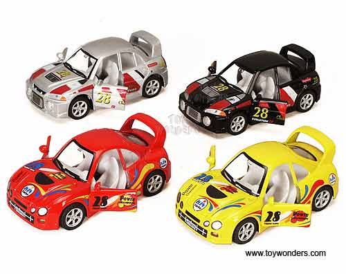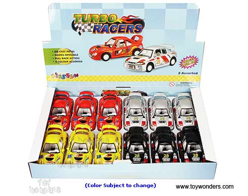 5008/10DH Turbo Racer Undecorated. 5" long diecast collectible model car. This racer car is a 5"L x 2.5"W x 2"H diecast metal car with openable doors and pullback motor action. Colorful logos and graphics on cars. Manufactured by Kinsmart/ Kinsfun. 72 pcs per inner box. 12 pcs per display box and in assorted colors.