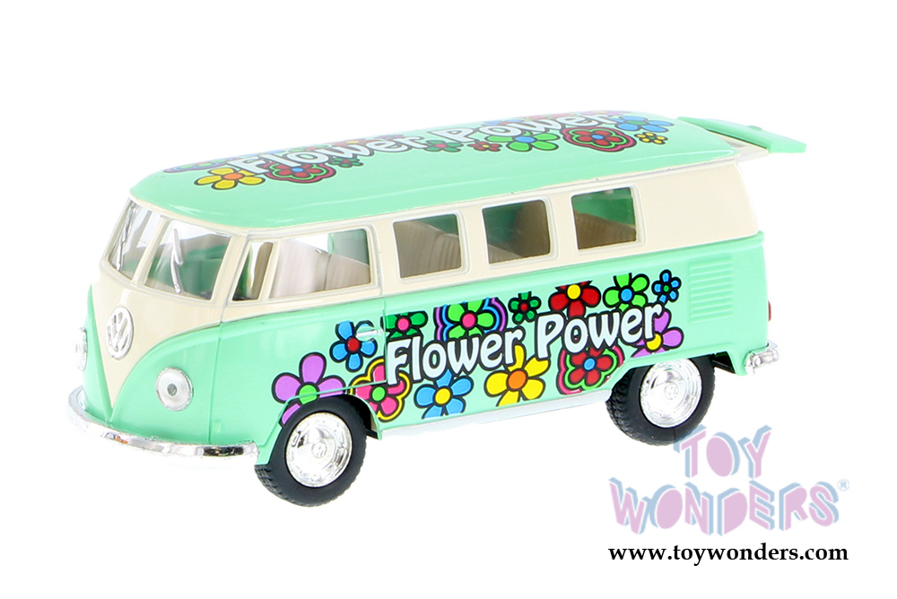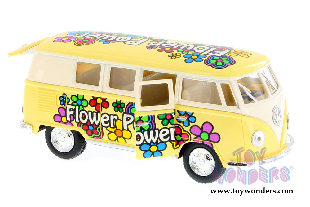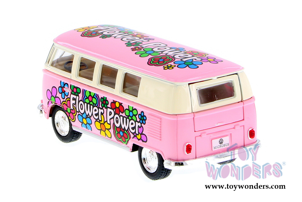 5060DYF Kinsmart - 1962 Volkswagen Classic Bus with Flower Decals. 1:32 scale diecast collectible model car. This 1962 VW Bus is a 5.25"L x 2"W x 2.25"H diecast metal classic with openable passenger door and rear hatch. This Volkswagen also comes with pullback motor action. This 1962 VW Bus is manufactured by Kinsmart/ Kintoy. 12 pcs per display box in assorted pastel colors. 72 pcs per inner box.