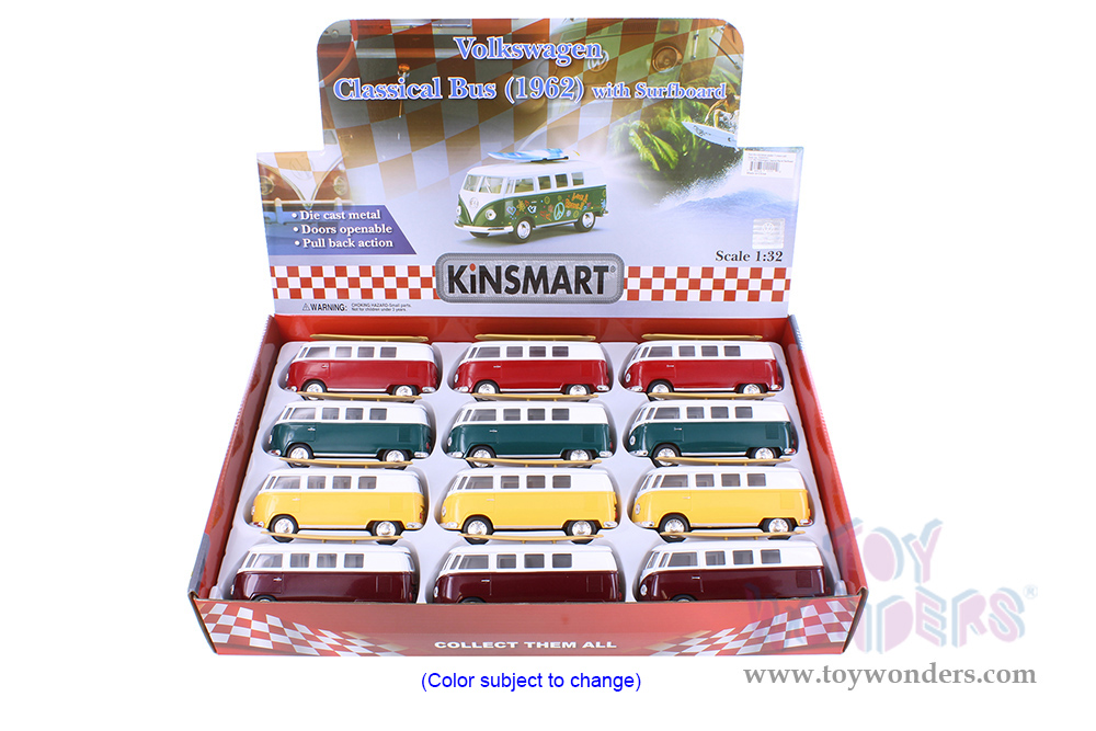 5060DS1 Kinsmart - 1962 Volkswagen Classic Bus with Surfboard. 1:32 scale diecast collectible model car. This 1962 VW Bus is a 5.25"L x 2"W x 2.5"H diecast metal classic with attached surfboard openable passenger door and rear hatch. This Volkswagen also comes with pullback motor action. This 1962 VW Bus is manufactured by Kinsmart. 12 pcs per display box in assorted colors. 72 pcs per inner box.