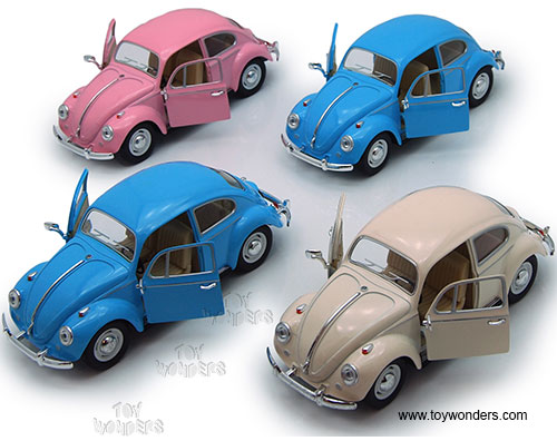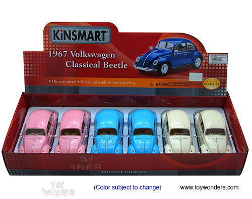 7002DY Kinsmart - 1967 Volkswagen Classic Beetle Hard Top. 1:24 scale diecast collectible model car. This 1967 Volkswagen beetle is a 6.5"L x 2.5"W x 2.25"H diecast metal classic with openable doors and free wheeling. This 67 VW Bug is manufactured by Kinsmart. 6 pcs per display box in assorted pastel colors. Z8